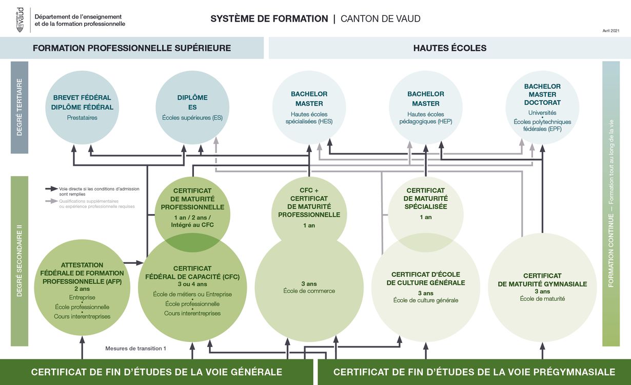 Le schéma interactif du système de formation vaudois permet de découvrir les différents parcours de formation possibles après la scolarité obligatoire.